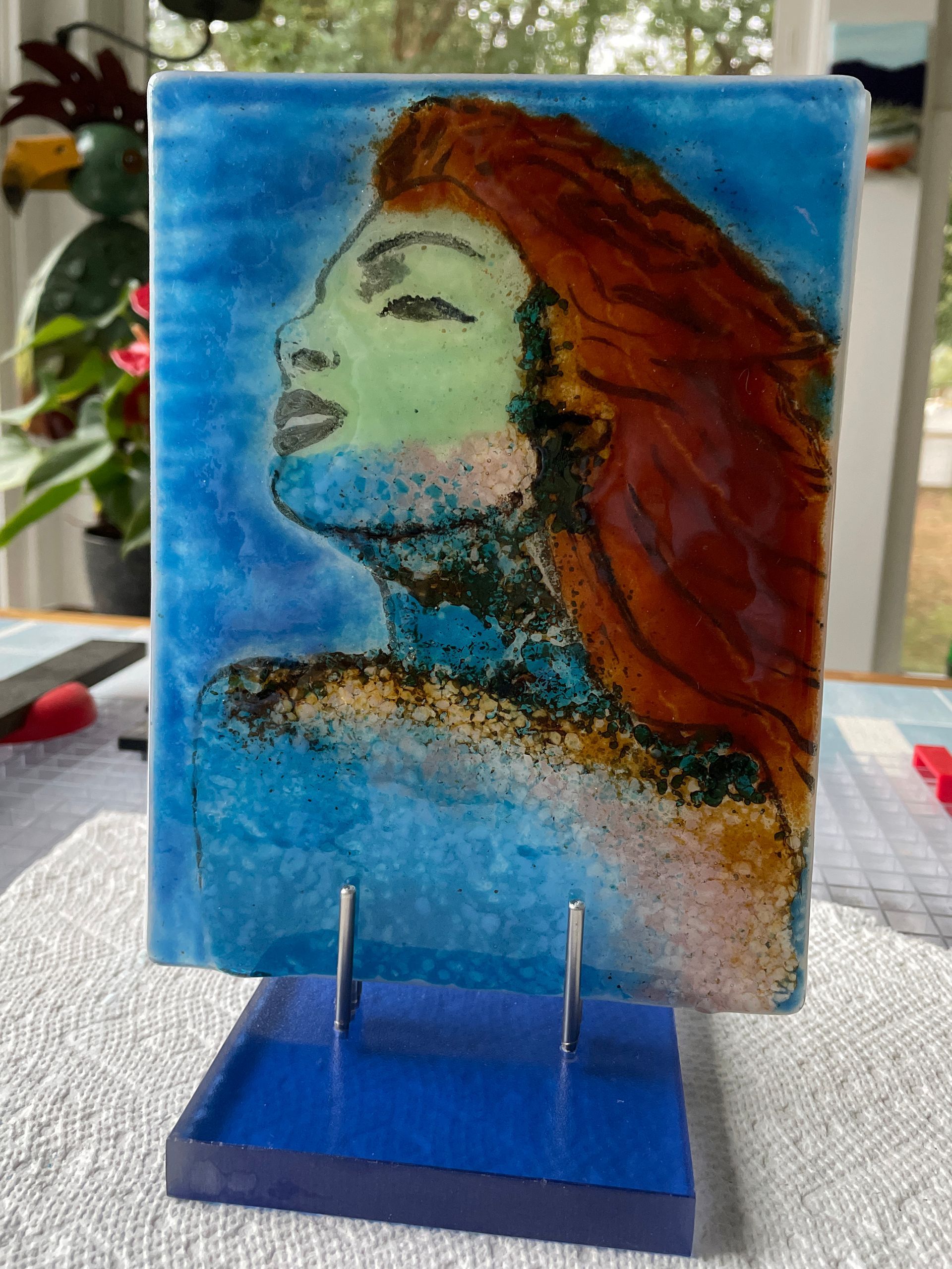 I started with cutting a rectangular piece of persimmon glass as well as a base of clear. In previous pieces, I loved how the persimmon and turquoise colors worked together and often created a gradient. But that effect was created by using only glass powder and sifting one color next to or over the other, multiple times. For this project I used opaque art glass and glass powder. The painting was created by using a paint brush to draw the pattern in the glass powder.